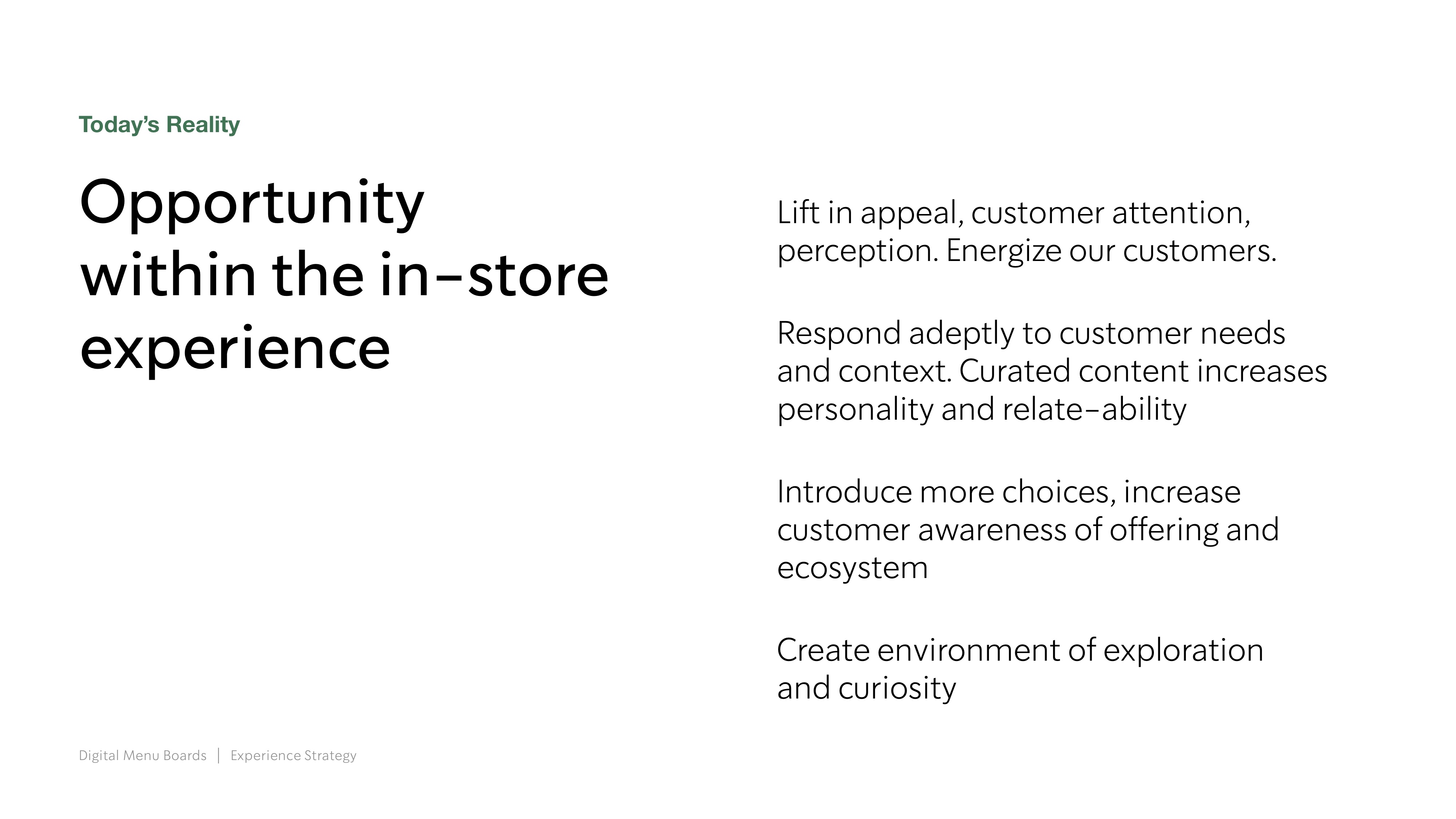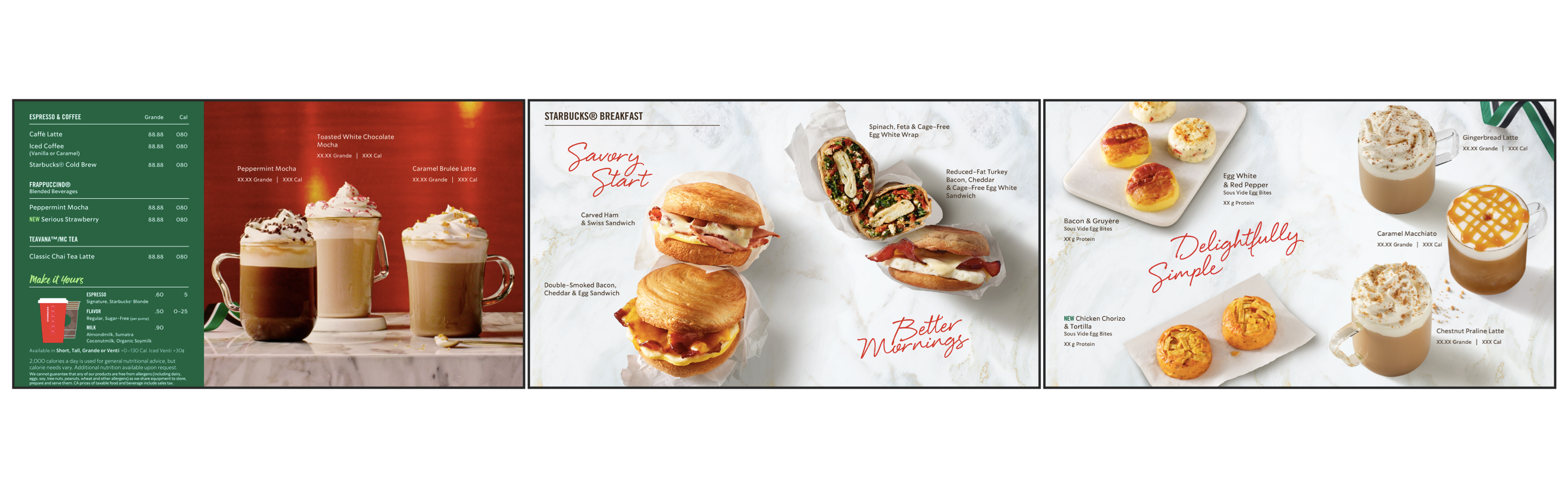 By conservative estimates, a Starbucks cafe sees at least 500 customers each day. The brand offers a extensive seasonally-relevant product offering, supported by customization and unique crafting variances. Turning attention to the in-store menu which consists of several printed panels showcasing 30-40 products, the opportunity to maximize communication becomes pretty darn exciting.