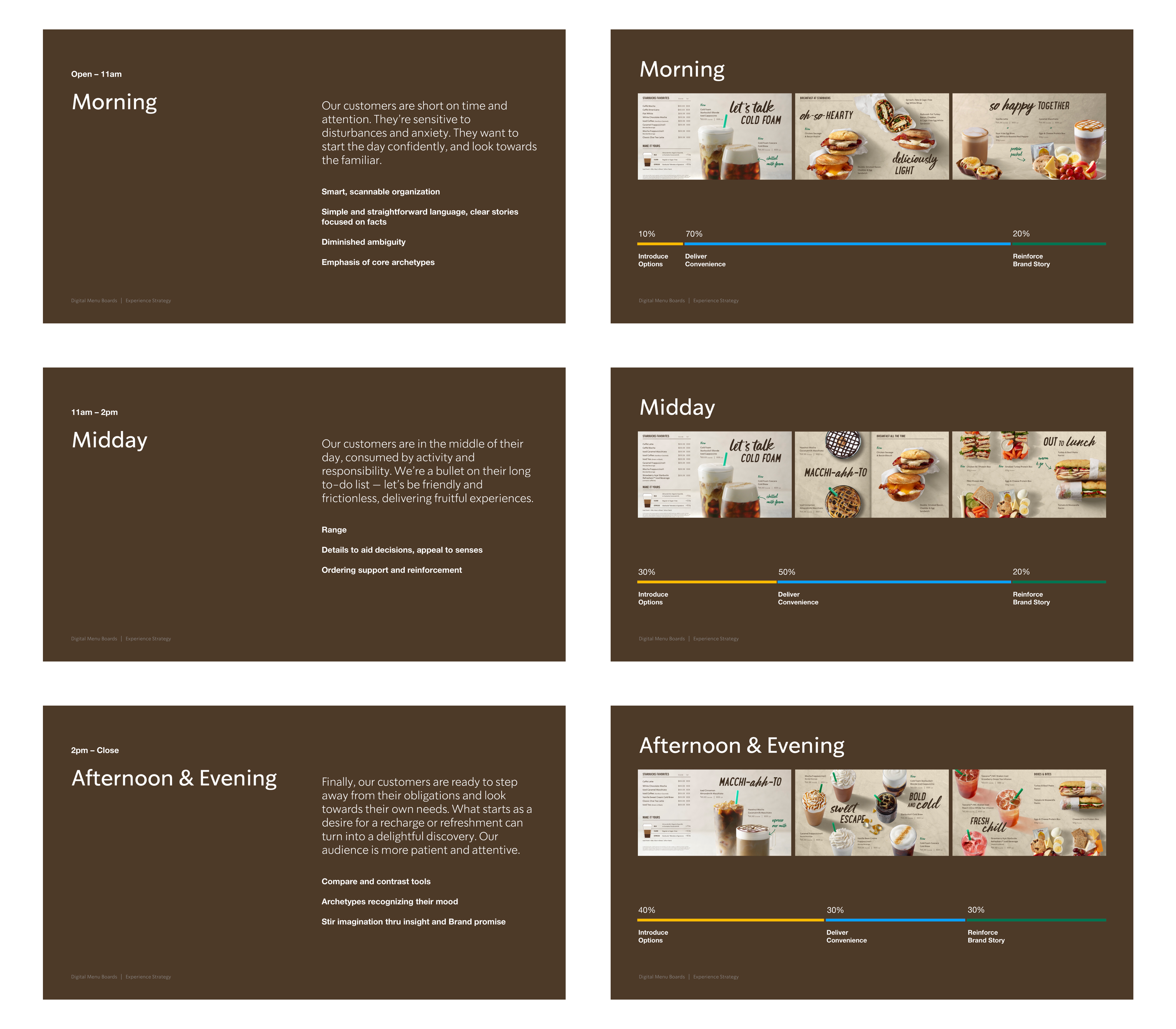 Initial launch focused on parity with non-digital menu stores, but upping ease in deployment. Variable content could be quickly managed on the backend, versus routing tens of versions to be laid out and printed. Our pilot stores represented 6 cafe types with unique products and logistics, so that variety was likewise matched by digital creative. For the win, we brought in support for 3 day parts, displaying unique menus for morning, midday, and afternoon.