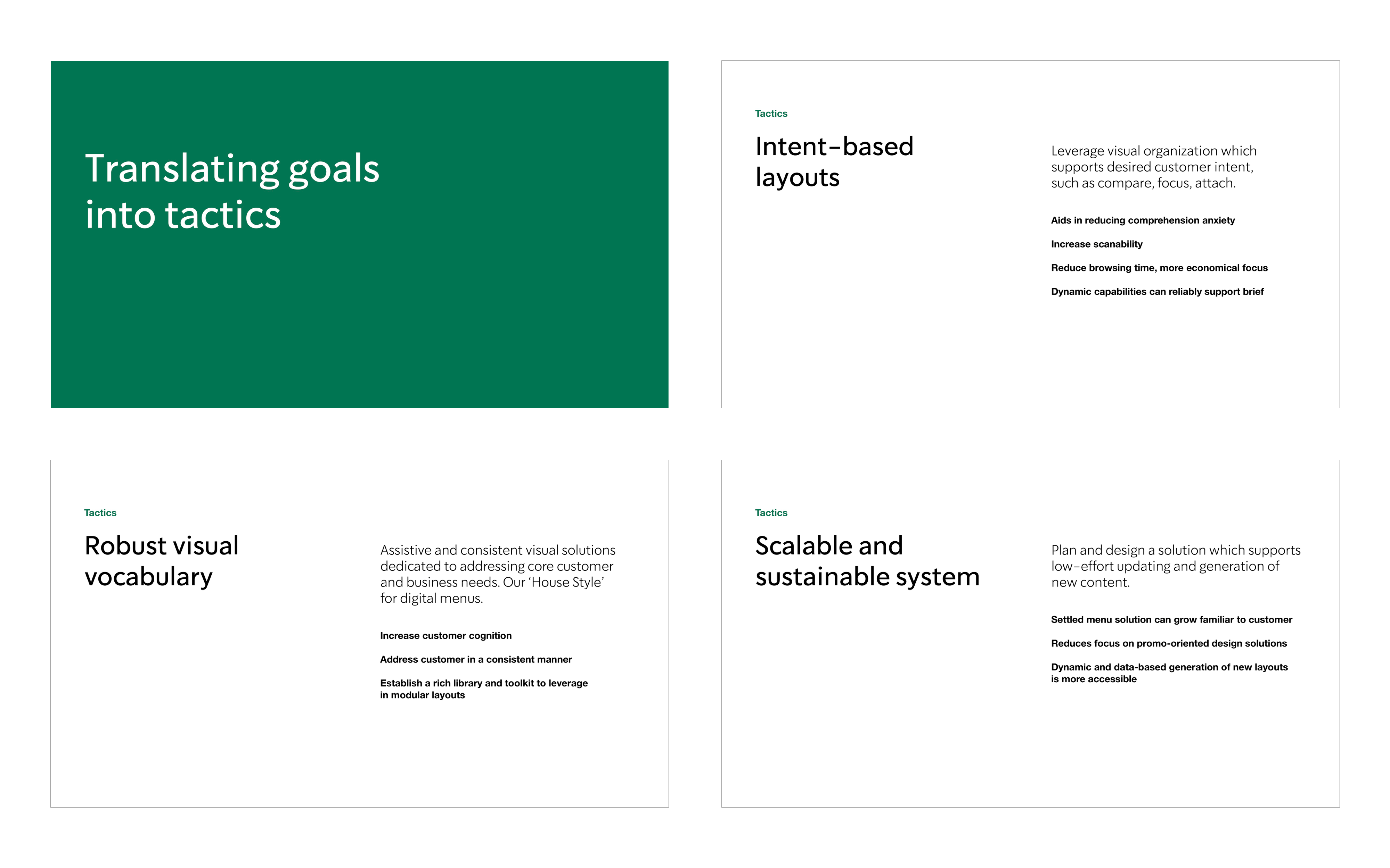 My strategy for designing the system behind the digital menu boards started with breaking down the desired variants the product would need to support, and their relationships. Levers for adjusting presentation were built at various altitudes in the product, to enable business-aligned dynamic updates. For instance, type and palette styling were decoupled from assets so that global changes to fonts or colors could be done without disturbing content.