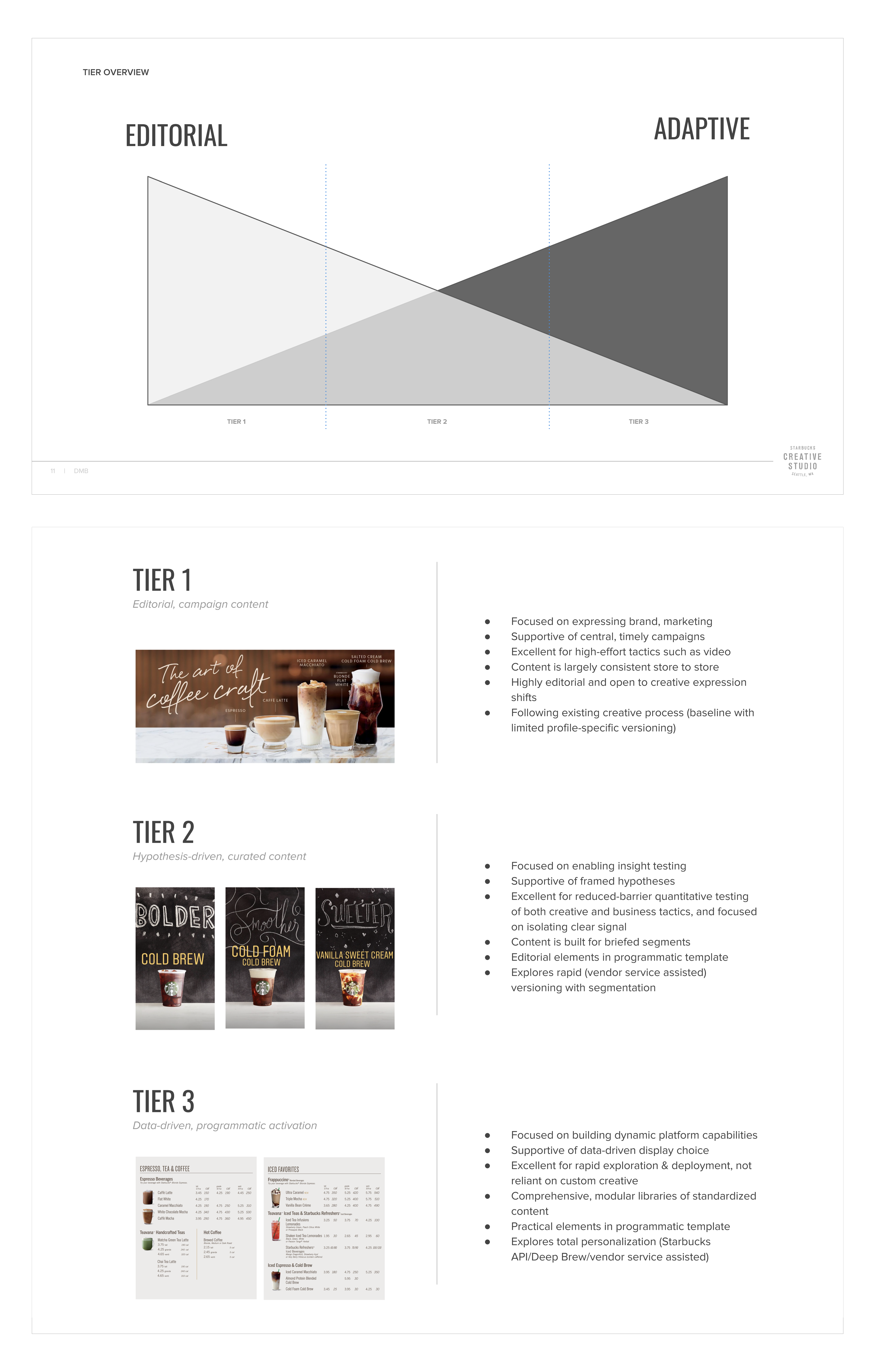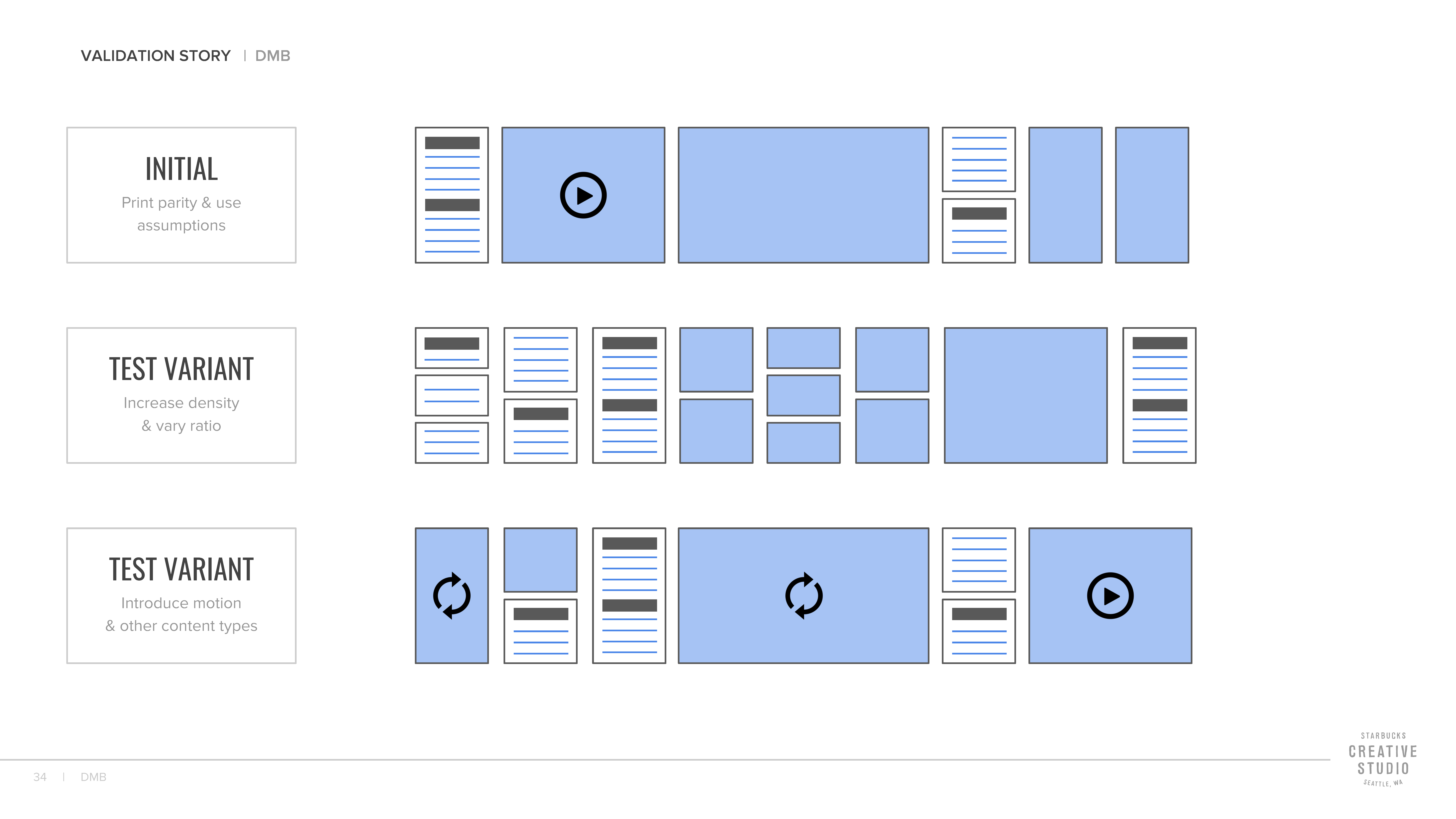 Creating impactful presentation can start internally, but true value lies in validation with Starbucks customers. The next milestone was outlining a testing roadmap which would reap insights and guide designers. Variant testing is practical in this regard as we can observe the success of various versions of content display templates, and continue evolution of ideas that test well.