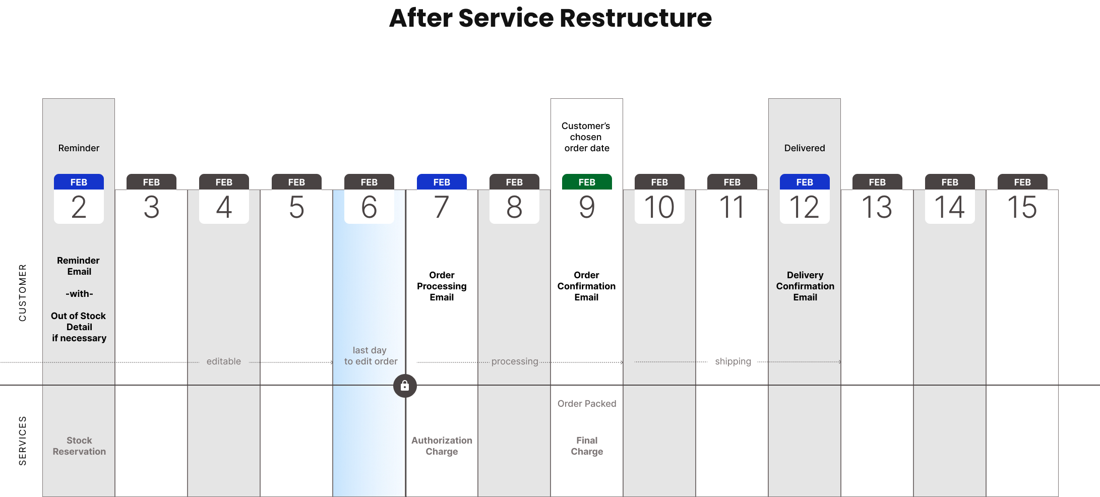 Though the updated interface aligned more closely with the customer's need to manage item frequency independently, we soon discovered other frustrations with the service—many tied to order processing mechanisms and backend timing.