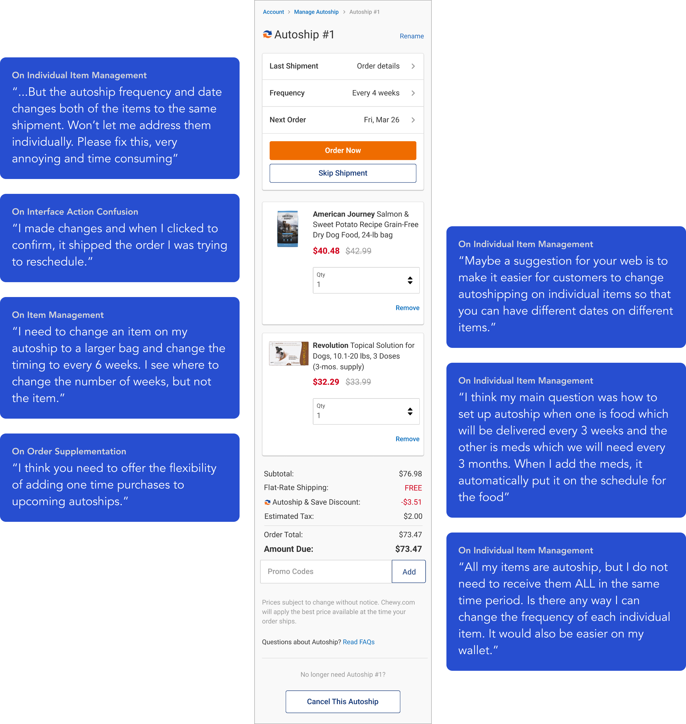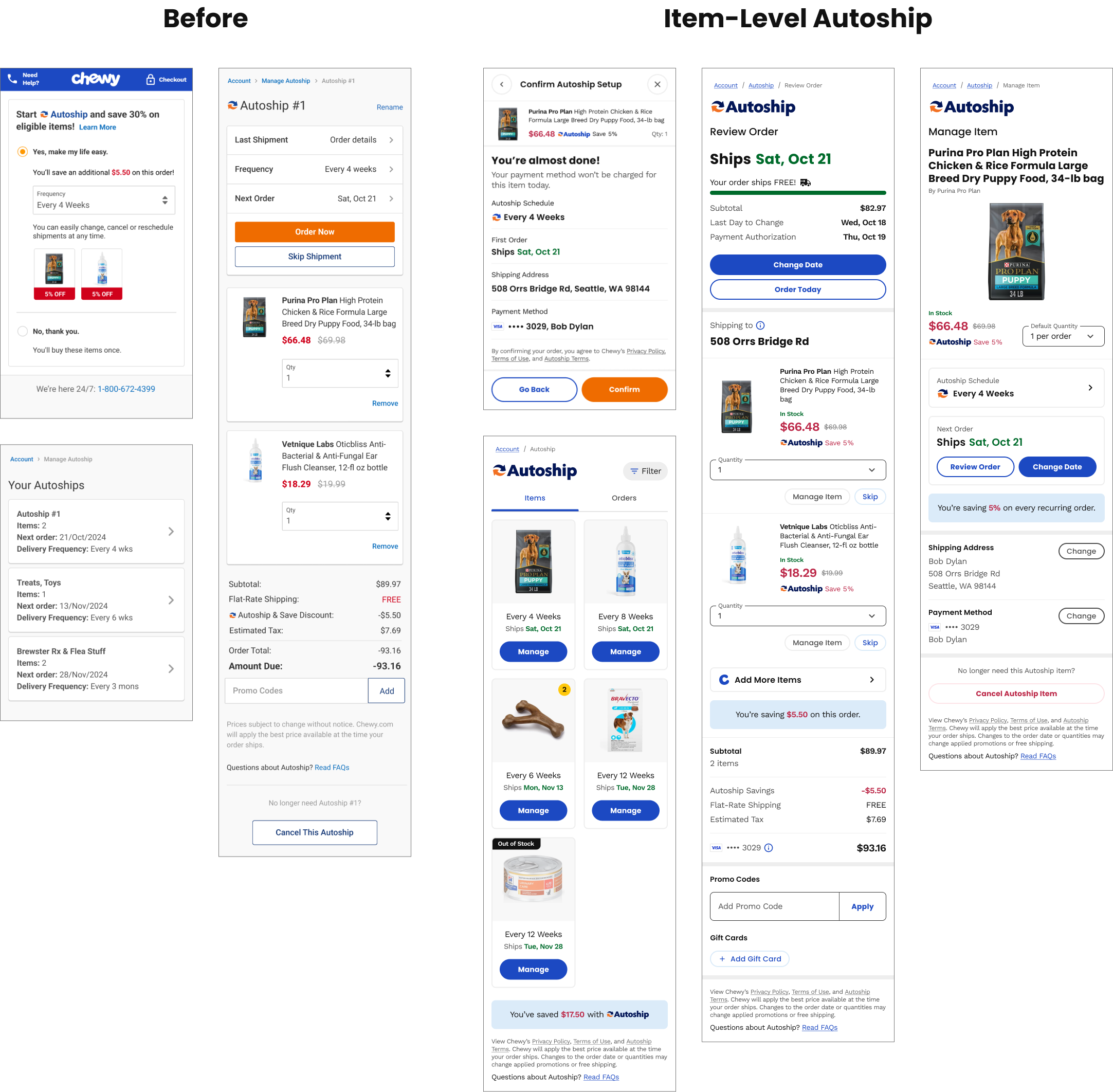 In the legacy interface, many customers resorted to canceling Autoship orders and using the cart when they couldn’t adjust timing to their needs. While this appeared as a high rate of churn quantitatively, UX research provided the full picture and helped define the customer mental model. Our redesign empowered customers to manage Autoship the way they think about grocery shopping—stocking up when needed, skipping when they don’t.