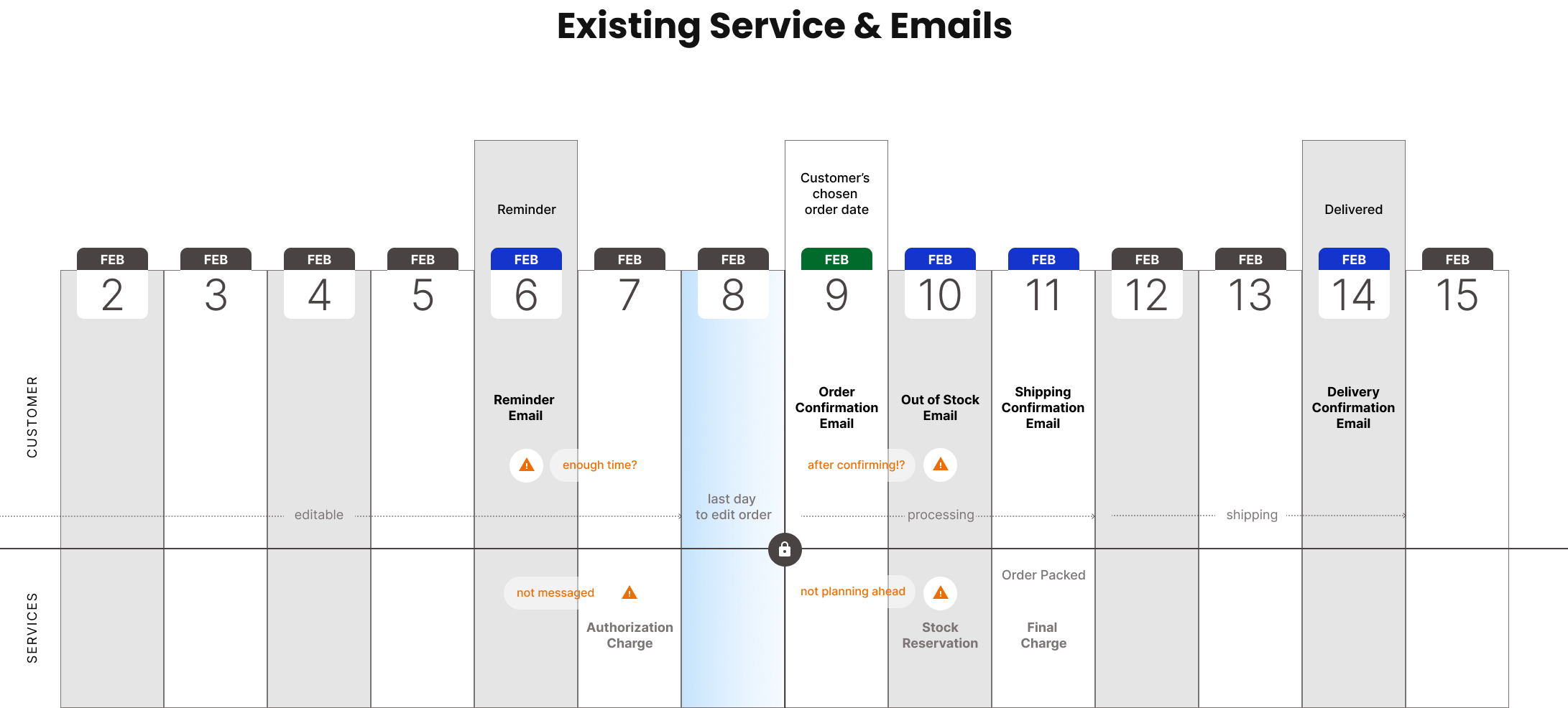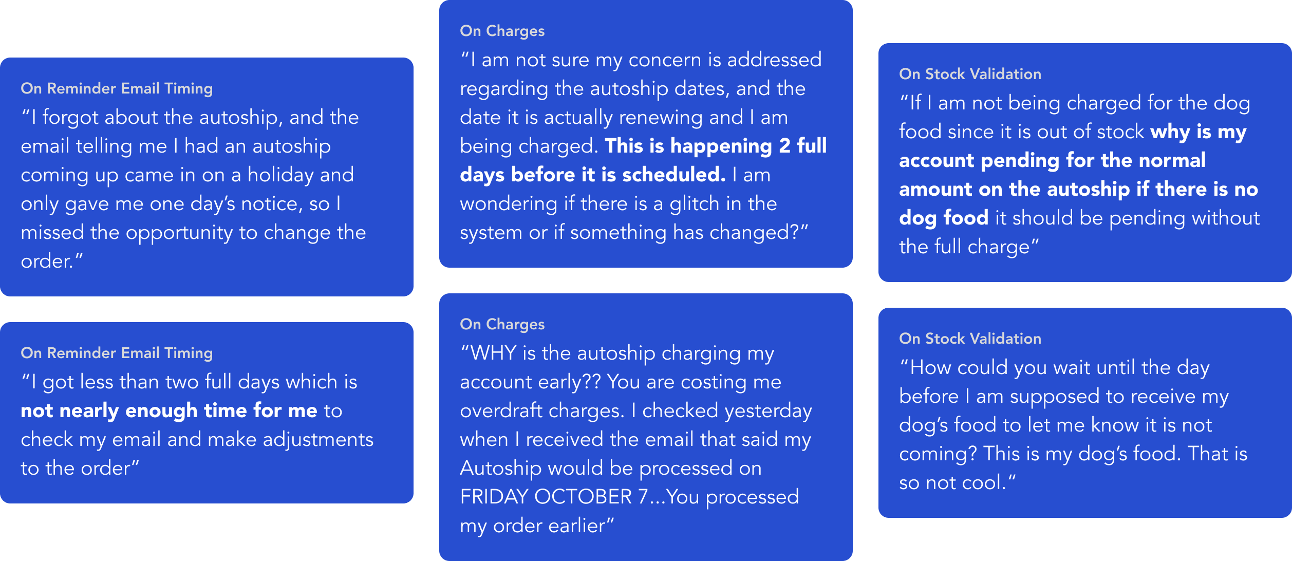 Creating a comprehensive timeline of our processes and email triggers helped frame customer frustrations—and pinpoint specific backend inefficiencies. Reminder email timing was tight, giving customers only 48 hours to make amendments. Many Autoship customers reached out for support upon seeing the authorization charge, which wasn’t mentioned in the interface or emails. Most surprisingly, while we promoted Autoship as a way to prioritize stock, we weren’t actually reserving inventory for Autoship customers.