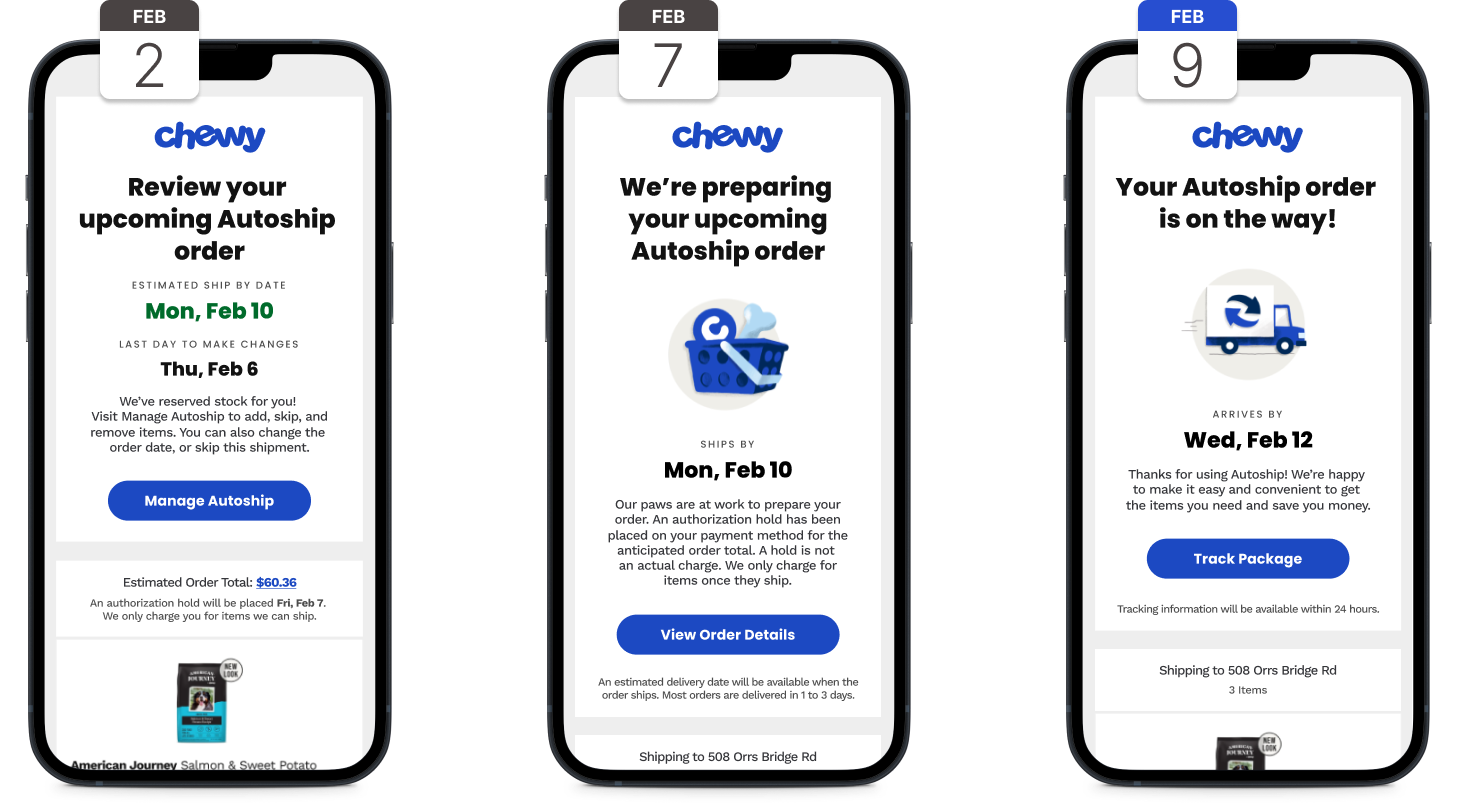 As it turns out, customers really do want to just set it and forget it—Autoship promises regular recurring delivery of pet medication, food, supplies, and treats on a schedule of the user’s choice. For Chewy pet parents, that generally means getting food once a month, flea meds quarterly, and the rest sporadically throughout. It’s easy to opt into Autoship during checkout, and the service is supported by a management portal and email-based notifications.