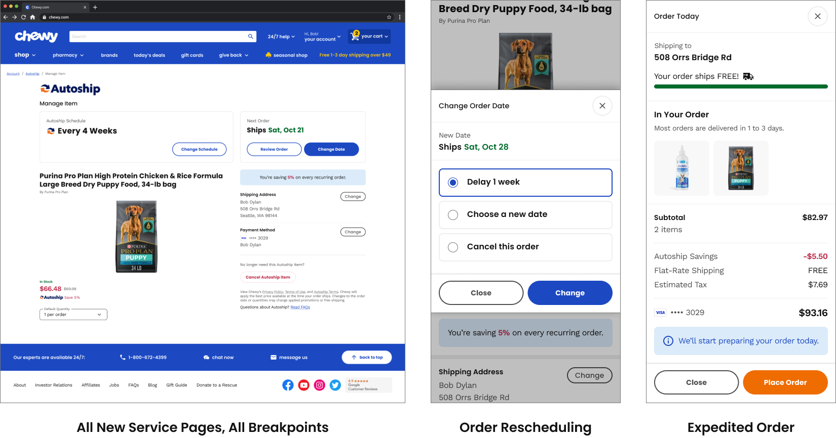 With the shift to item-level Autoship, the order construct became an event rather than the pattern. Items could ship together one month but recur only when needed. I expanded flows for customers looking to expedite their orders and simplified the process to postpone. Most critically, we ensured that customers just starting their Autoship subscriptions weren’t locked into receiving the same basket mix every month.