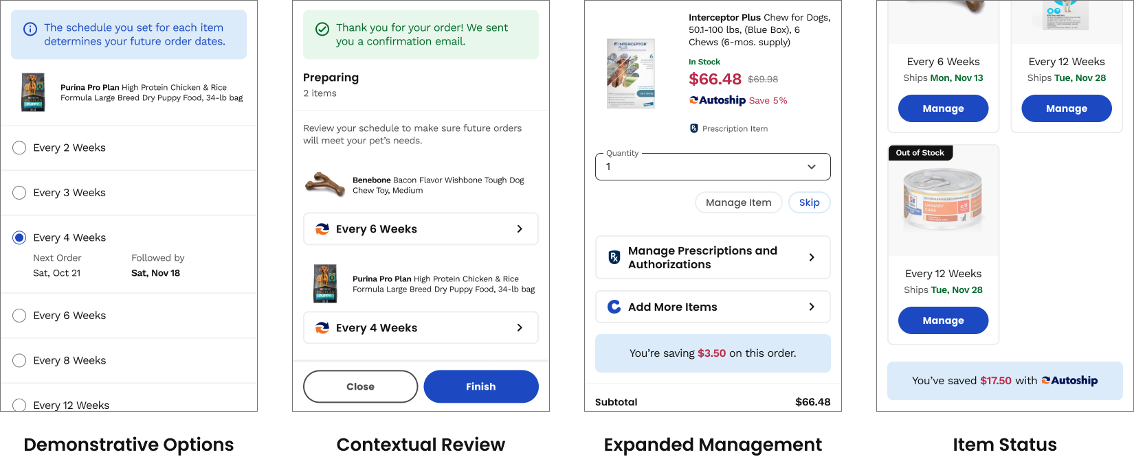 However, customers struggled to rely on the system, often finding themselves spending more time coordinating restocks than focusing on their pets. The legacy basket-enrollment model simplified initial setup by allowing customers to apply a recurring order agreement to an entire order, but it posed significant challenges for managing individual items. Customers frequently found that their needs for specific items, such as pet food, did not align with the cadence of other items, like medications—and the management interface didn’t allow individual items to be rescheduled.